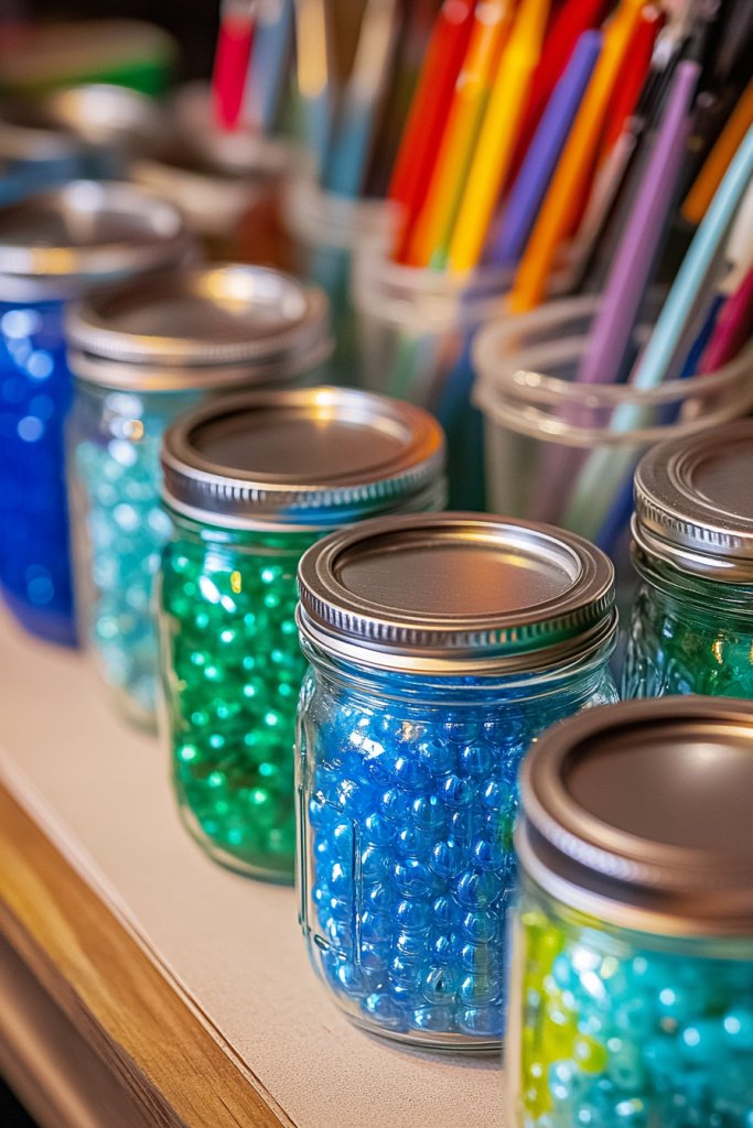 Picture a row of clear glass mason jars lined up on a wooden shelf or tray. Each jar holds different supplies—colorful buttons, paintbrushes, or glitter. Their transparency allows you to see everything at a glance, reducing search time. Add metal or wooden lids for variety, or tie a piece of twine around the neck for extra charm. It’s a simple solution that turns chaos into order with style.