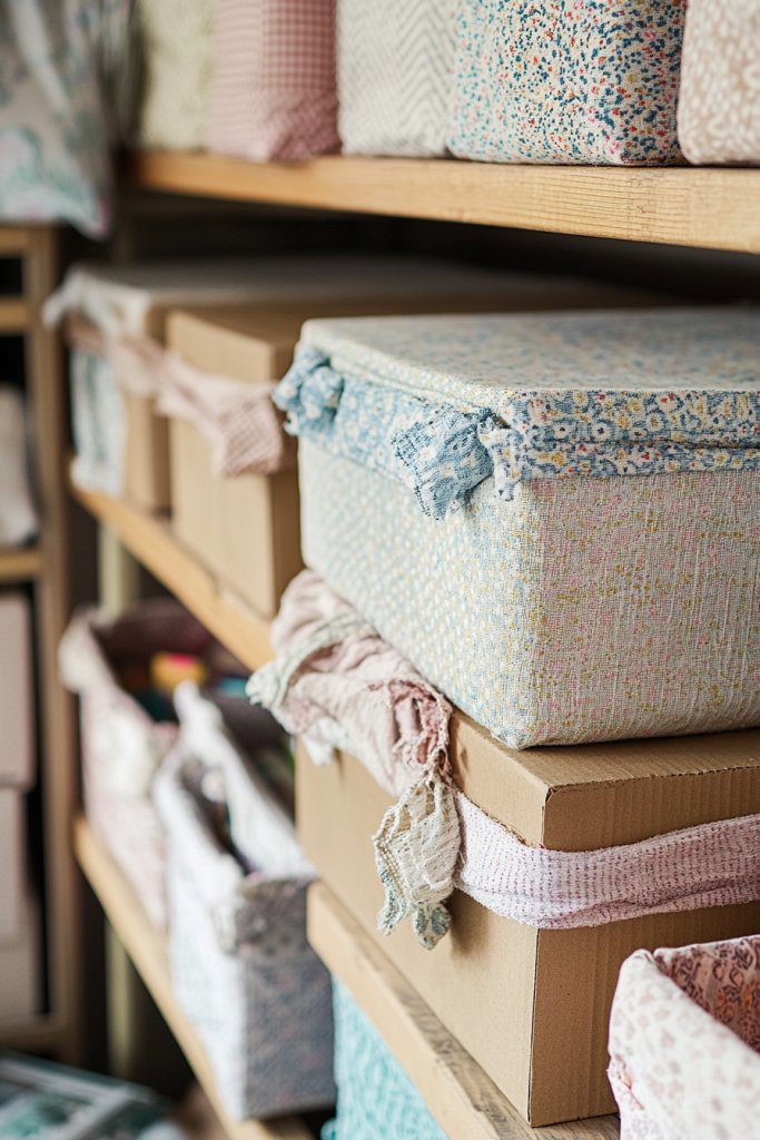 Imagine a row of colorful fabric-covered boxes stacked neatly on a shelf or tucked under your worktable. The fabric patterns—florals, geometrics, or solids—coordinate with your decor. The soft texture contrasts beautifully with the cardboard’s rough surface, creating a warm, inviting vibe. These bins hide supplies like paper, yarn, or tools, yet look stylish enough to leave out in the open.