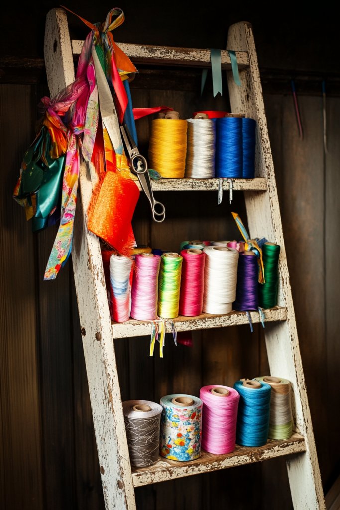 Visualize a rustic wooden ladder propped against a wall, with hooks holding scissors, rulers, and spools of ribbon. Fabric rolls hang from the rungs, easily accessible for quick projects. The natural wood adds texture and warmth, giving your space a vintage farmhouse feel. It’s a clever way to organize while adding a charming focal point. The open design invites creativity and keeps supplies within arm’s reach.