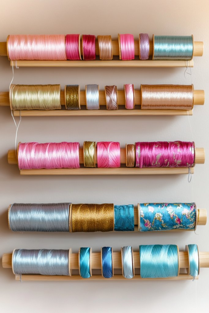 Imagine a sleek, minimalist wall with evenly spaced dowels or hooks holding colorful ribbons and threads. The materials—wood, metal, or sturdy plastic—are mounted flush against the wall, creating a tidy ribbon runway. Small labels or clips keep each type separated and easy to find. The visual appeal is clean and organized, inspiring you to craft more efficiently. It’s a smart, space-saving upgrade that looks good too.