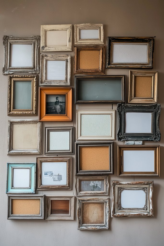 Picture a collection of vintage frames painted in coordinating colors or distressed for a shabby chic look. Inside, you can insert cork panels, magnet sheets, or fabric-covered boards. Pin inspiration snippets, sketches, or notes to the frames, turning each into a mini gallery. The mix of textures and frames adds visual interest and personality. It’s a creative way to keep ideas front and center.