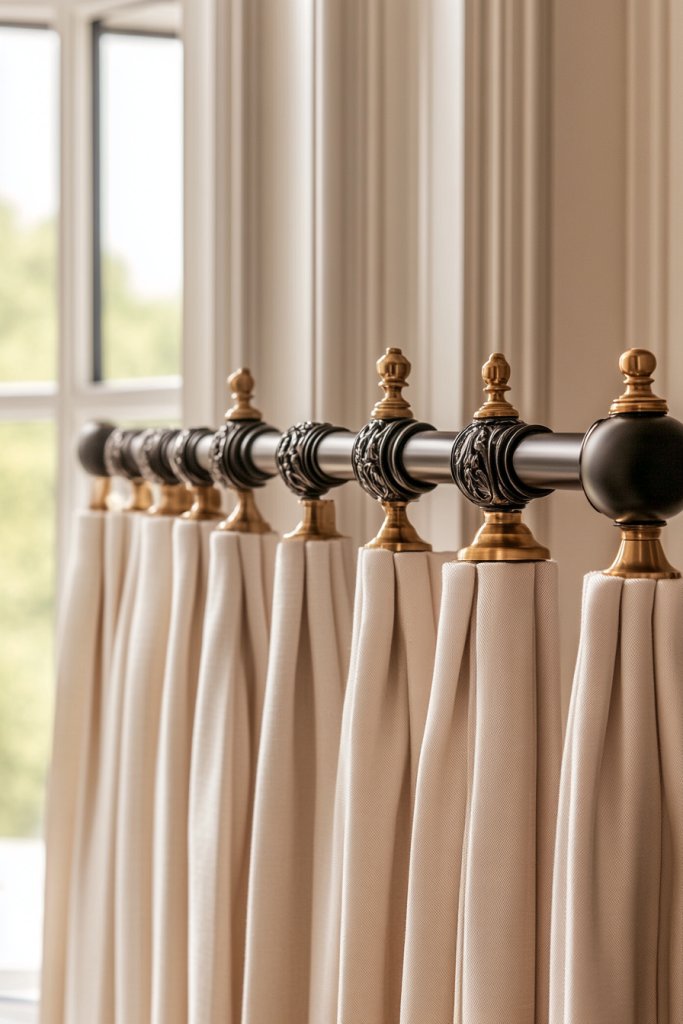Visualize ornate metal or wood rods with intricate finials—think scrollwork, floral motifs, or sleek modern designs. The finials act as jewelry for your curtains, drawing attention upward and framing your window beautifully. When curtains are drawn back, the decorative ends peek out, adding a subtle layer of luxury. It’s a small detail that offers big style impact.