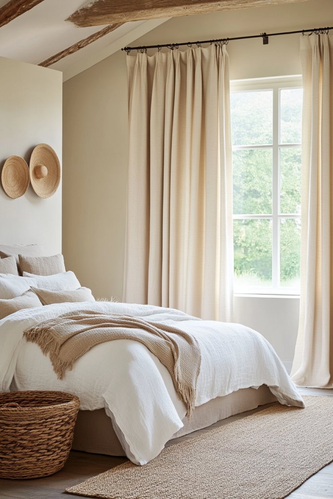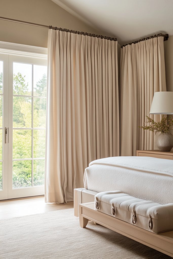 Craving a bedroom that feels layered and rich without heavy patterns? Soft-toned curtains with subtle texture weaves provide depth and interest through tactile fabric without overwhelming the senses. They’re perfect for a calm, sophisticated atmosphere that invites relaxation. If understated elegance is your thing, this idea is ideal.