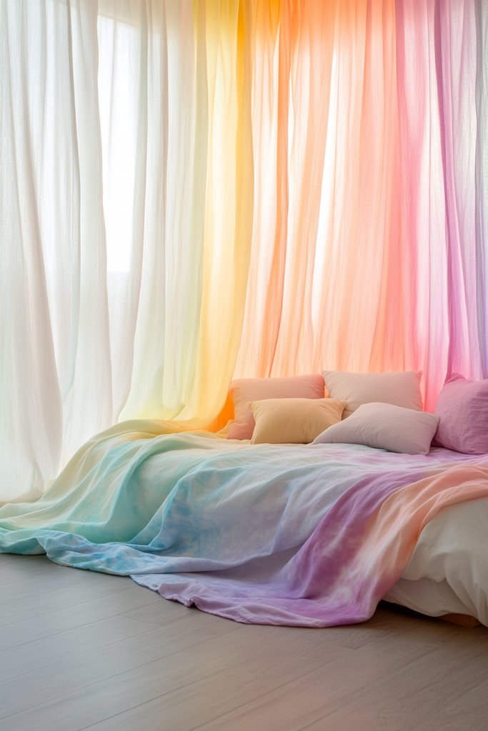 Looking to inject some personality and artistic flair into your bedroom? Tie-dye or ombre curtains bring a creative, one-of-a-kind vibe that’s both trendy and personal. They add a splash of color and movement, making your space feel lively and unique. If you love artistic touches, this idea is for you.