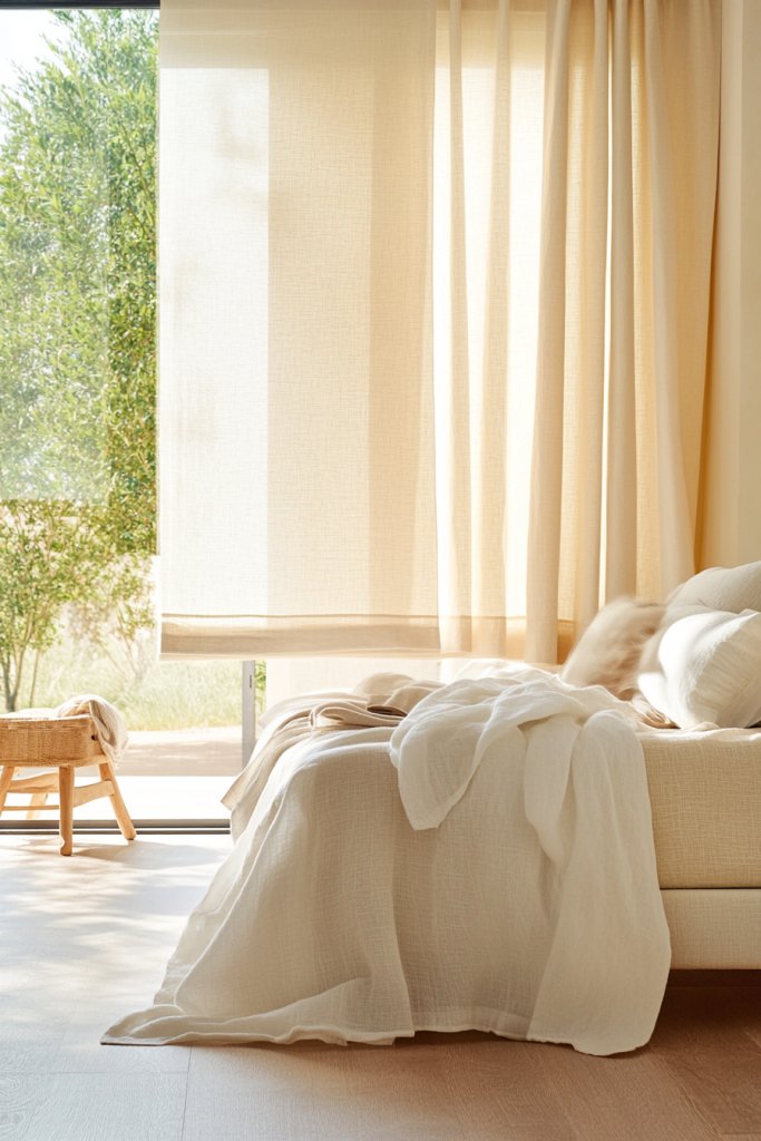 Imagine natural linen blinds in neutral shades rolled up or down, with sheer or light-colored curtains layered over or beside them. The linen’s subtle texture adds interest, while the curtains soften the overall look. When the blinds are open, light filters gently, illuminating your space with a warm glow. When closed, they provide privacy and insulation, transforming your bedroom into a serene oasis.