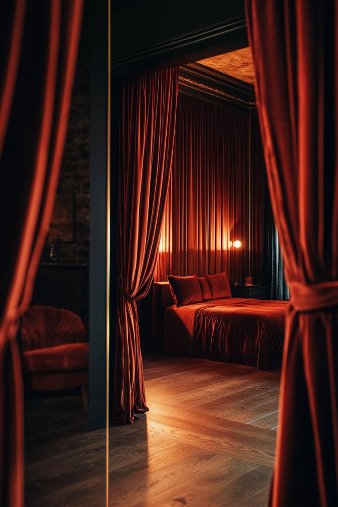 Imagine plush velvet drapes in a deep, rich hue cascading from ceiling to floor, pooling slightly at the base. The fabric catches the light with a subtle sheen, adding depth and texture. The curtains frame your windows beautifully, giving your space a layered, luxurious look. Soft, diffused natural light filters through, creating a cozy, intimate glow that invites you to unwind.