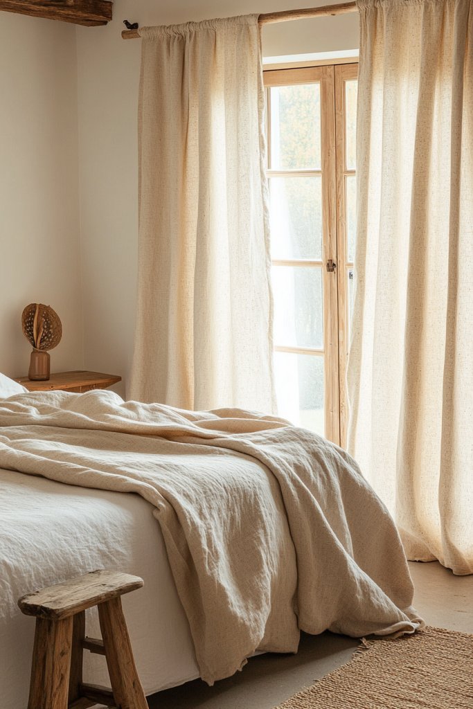 Picture soft, slightly textured linen fabric in neutral shades—think cream, taupe, or light gray—hanging in relaxed folds. The natural fiber adds an organic touch that complements wooden furniture and woven textiles. The wooden curtain rod, with its raw, unfinished look, ties the room together, enhancing the rustic charm. When pulled aside, the curtains reveal a view framed by natural materials, emphasizing the room’s earthy, laid-back mood.