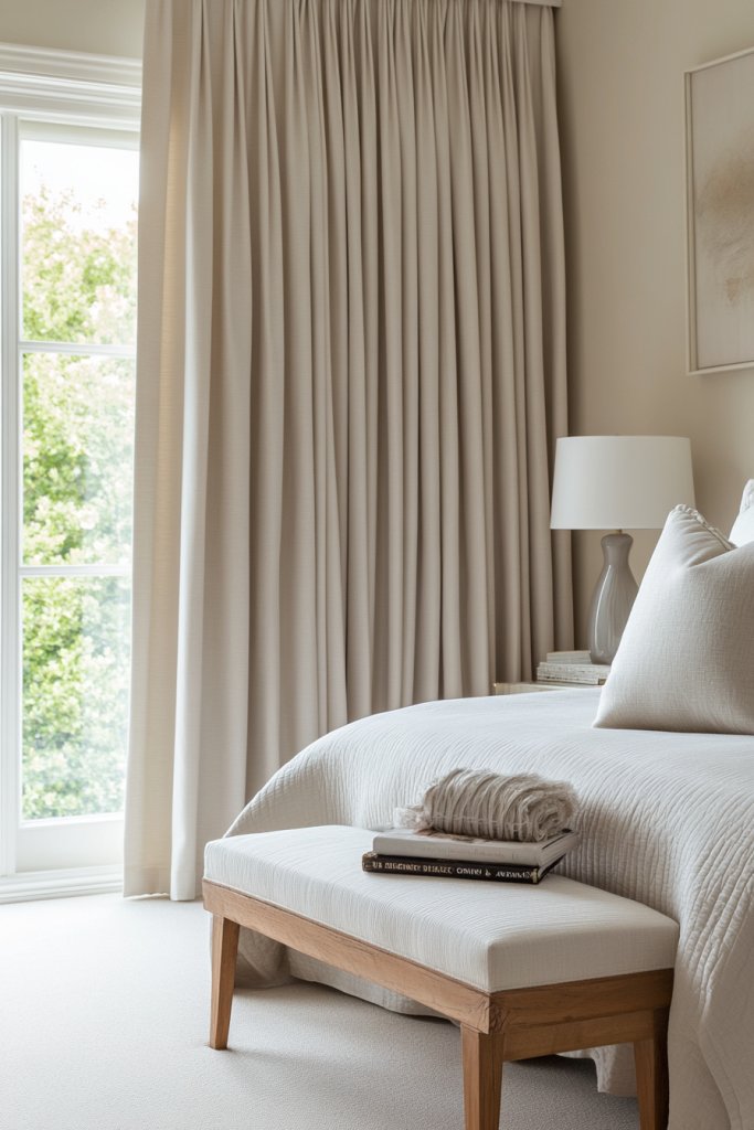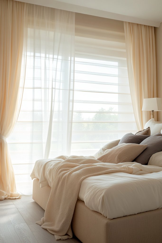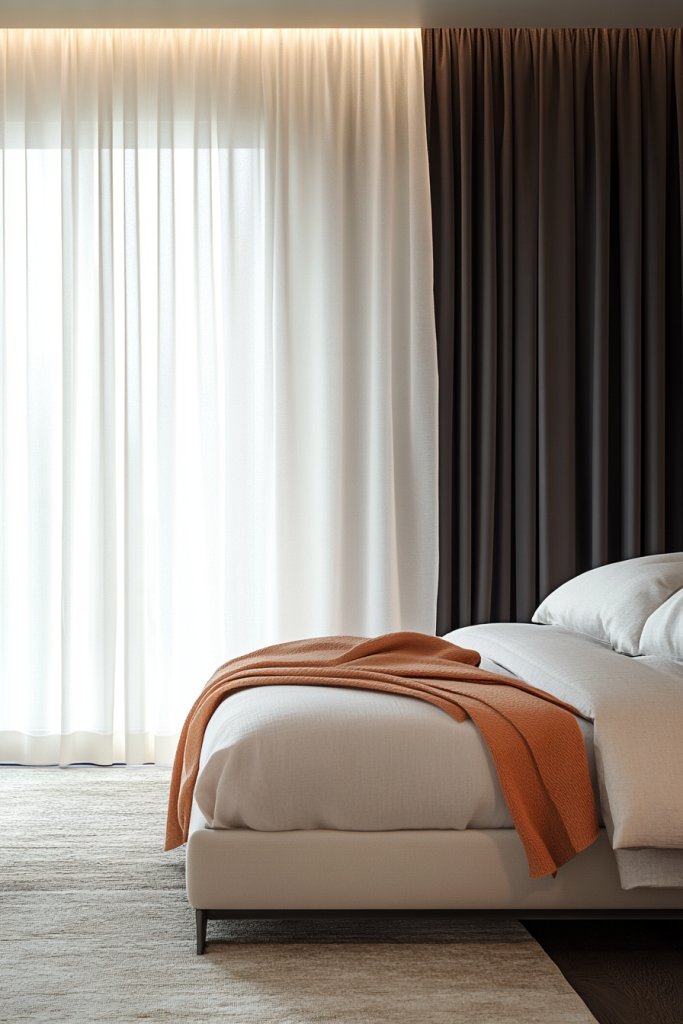 Layered curtains elevate your room’s decor, giving it a hotel-like ambiance that’s both practical and beautiful. They allow you to easily switch from bright, sunlit mornings to private, cozy evenings. With this setup, you can enjoy full control over your space, making your bedroom a true sanctuary of style and comfort.