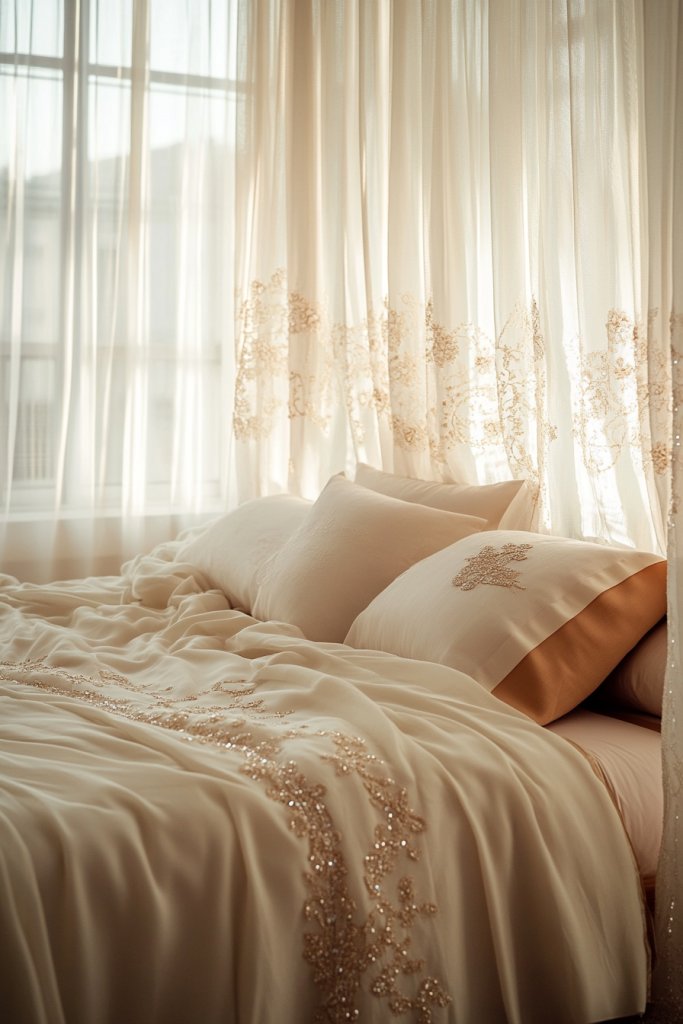 Embroidered or beaded curtains bring a sense of craftsmanship and luxury to your bedroom, making it feel special. They reflect your attention to detail and love for exquisite decor. With this touch, your space becomes not just a bedroom, but a personal gallery of style and elegance—confidently showcase your taste.