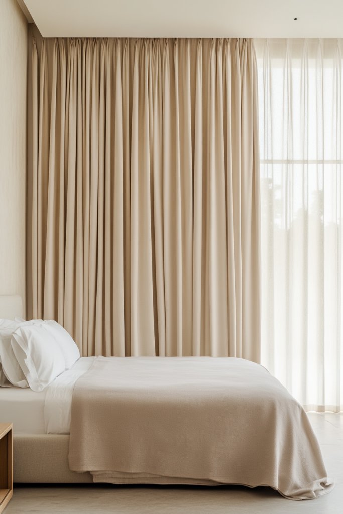 Imagine curtains hanging smoothly from a discreet track or concealed rod, with no visible hardware disrupting the clean aesthetic. The fabric, in solid neutral tones or subtle textures, drapes effortlessly, emphasizing the room’s minimal design. When drawn, the curtains stack neatly without bunching, maintaining the uncluttered look. The overall effect is a serene, modern environment where every element has a purpose and place.