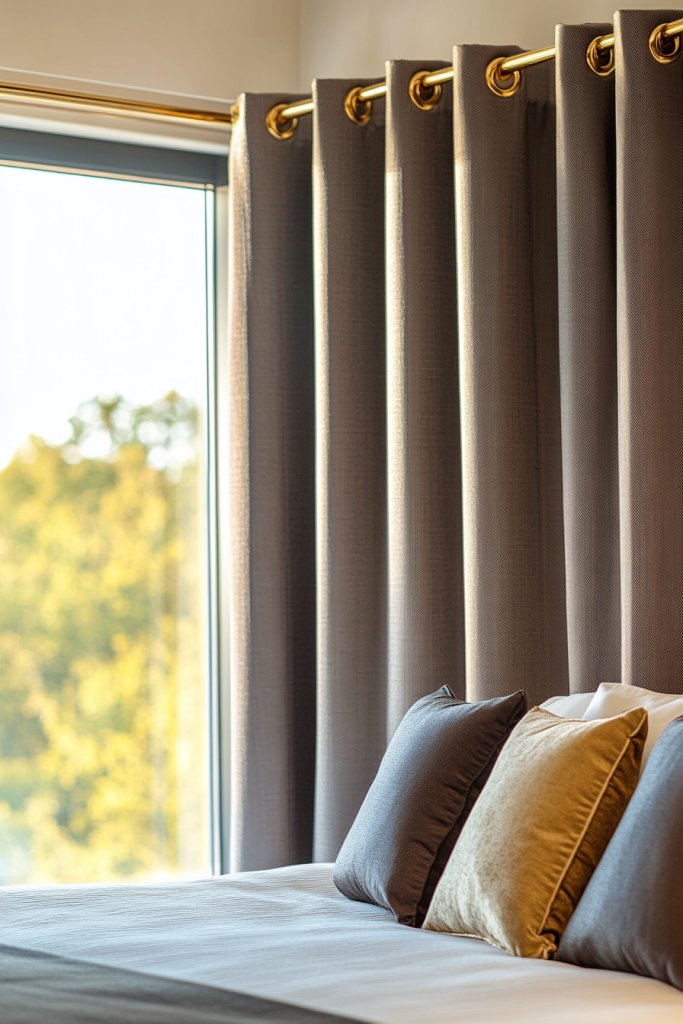 Grommet-top drapes with metallic accents streamline your decor, offering a modern, clutter-free appearance. They’re easy to operate and maintain, giving you effortless style and function. With this look, you can confidently craft a bedroom that feels fresh, sleek, and effortlessly elegant—perfect for today’s design sensibilities.