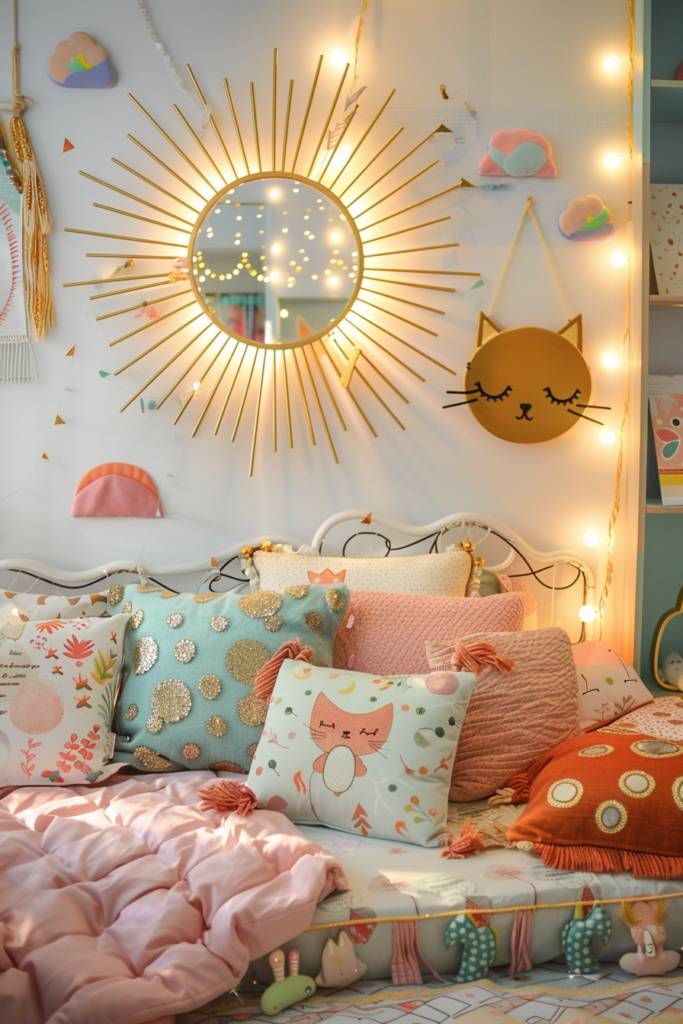 A vibrant bedspread can set the tone for your entire bedroom, but don’t overlook the power of a fun statement mirror to elevate your decor further. These mirrors aren’t just for checking your reflection; they’re works of art that can transform your space. Picture a sunburst mirror that radiates warmth, adding a playful touch to your walls. Or imagine a whimsical, oversized cloud-shaped mirror that invites daydreams and creativity.