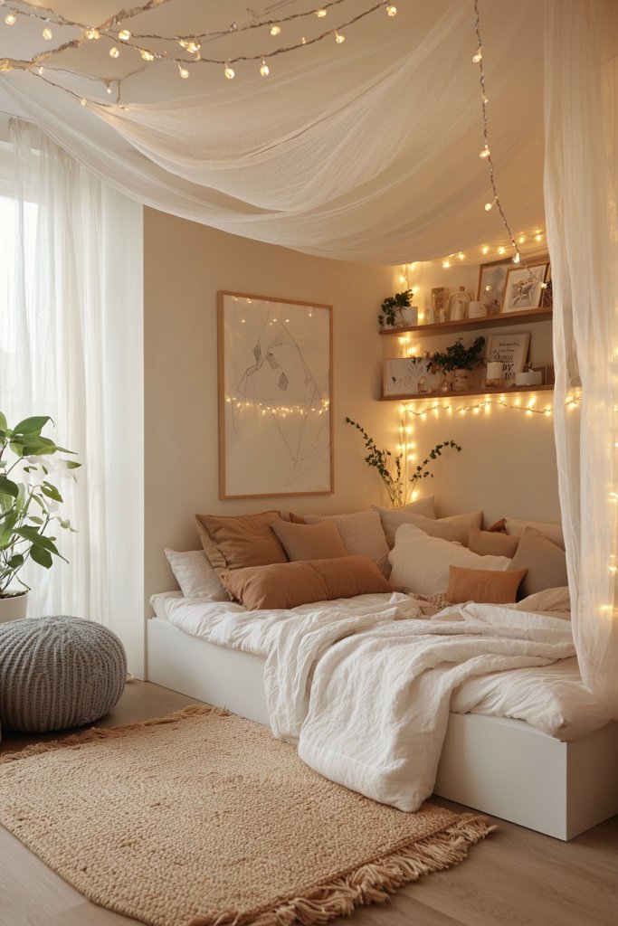 After you’ve anchored your space with a vibrant area rug, adding charming fairy lights can elevate the ambiance even further. These twinkling gems aren’t just for the holidays; they create a whimsical atmosphere year-round.
