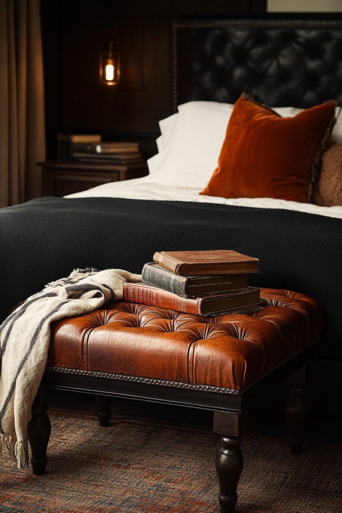 Imagine a worn-in, soft leather ottoman with brass or dark metal accents, nestled at the foot of your bed or beside a vintage armchair. Its textured surface invites touch, while its sturdy frame supports books and cushions. The rich leather complements dark wood furniture and textured textiles, creating a layered, inviting look. It’s both functional and stylish.