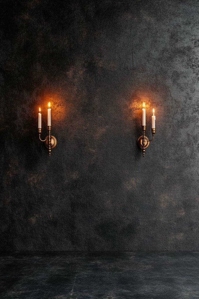 Imagine antique brass or wrought iron sconces mounted on dark, textured walls, casting gentle shadows. The flickering candlelight creates a romantic glow, illuminating vintage books, textured textiles, and dark wood furniture. The sconces’ intricate details add to the room’s layered, scholarly aesthetic. Their subtle presence transforms your space into a candlelit library.