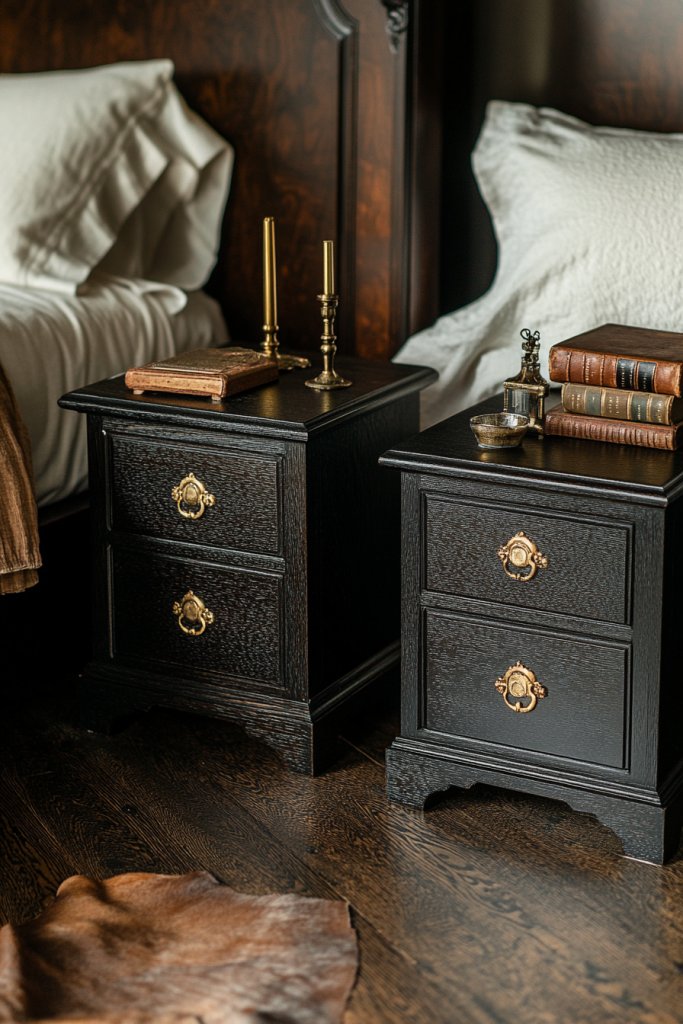 Looking for nightstands that blend functionality with vintage sophistication? Dark wood or matte black nightstands with traditional hardware elevate your bedside area into a refined, scholarly space. They provide storage and style without clutter. Plus, they anchor your decor with a classic touch.