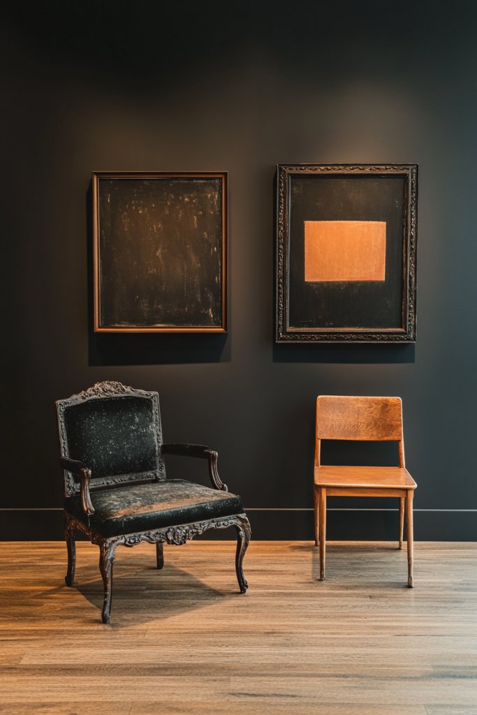 16. Minimalist, Dark-Toned Art Prints in Ornate Frames