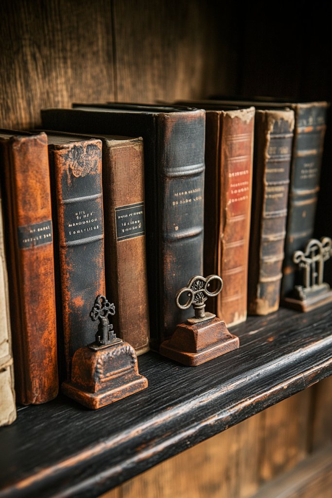 Imagine aged metal or distressed wood bookends shaped like sculptures, globes, or classic literary symbols. They support your vintage books while adding visual interest. Nearby, small trinkets like antique keys, vintage cameras, or miniature busts create a layered, scholarly display. These accessories evoke a sense of history and curiosity.