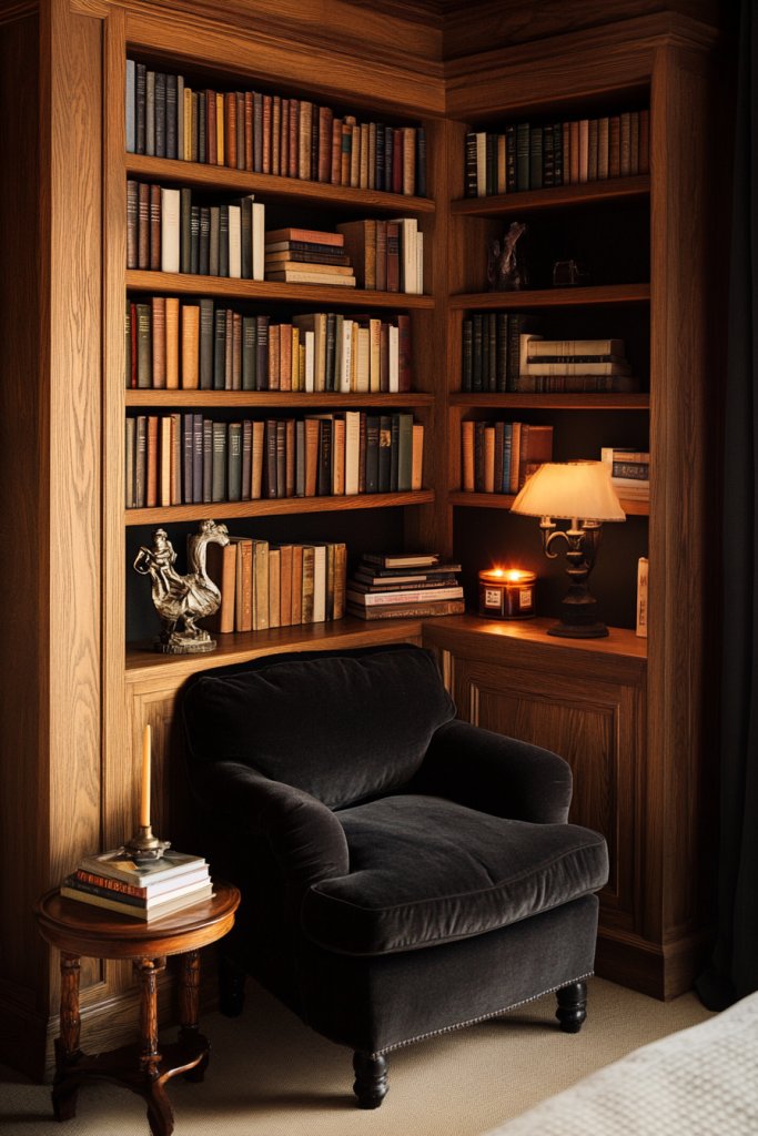 Visualize dark wood or matte black shelving hugging the wall, filled with leather-bound volumes and antique-inspired titles. A plush armchair or a vintage chaise lounges nearby invites you to sit and immerse yourself. Soft lighting casts warm glows over the spines of your favorite books, while textured throws complete the scene. The space feels both intimate and scholarly.