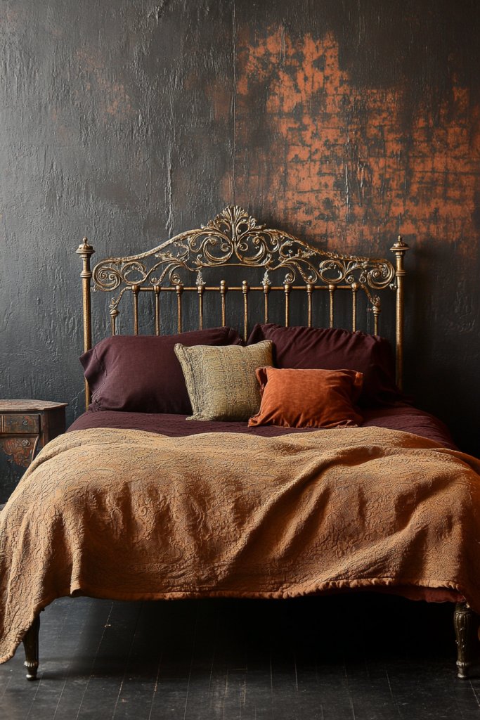 Picture a wrought iron frame with scrolling motifs and antique brass accents, standing proudly in your room. The dark metal contrasts beautifully against deep-colored walls, adding depth and texture. Heavily textured bedding, layered with velvet or embroidered fabrics, enhances the romantic, scholarly vibe. Candles or vintage lanterns on nearby surfaces finish the scene.