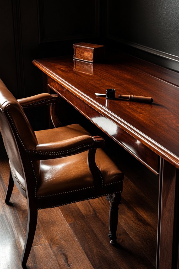 Search antique shops, online marketplaces, or custom furniture makers for authentic or reproduction vintage desks. Secure the desk to the wall if necessary for safety and stability. Use furniture polish suitable for dark woods to keep it looking aged but cared for. Decorate with vintage pens, inkwells, or a stack of classic books to complete the look. Maintain with regular dusting and polish to preserve its rich finish.