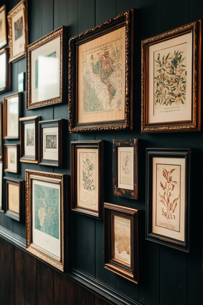 Looking to evoke a spirit of exploration and curiosity? Framed antique maps and botanical prints turn blank walls into portals of discovery. They add a scholarly, vintage touch that sparks imagination. Plus, they tie into the dark academia vibe perfectly without overwhelming your space.