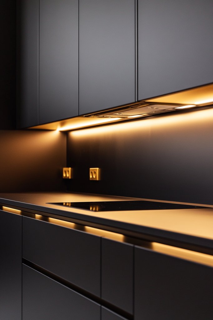 Visualize sleek black cabinets with soft, white LED strips installed beneath the upper cabinets. The light spills evenly across the countertop, emphasizing the dark cabinetry’s richness. The contrast between the black surfaces and bright lighting creates a modern, cinematic vibe. The glow accentuates textures and materials, making your kitchen feel larger and more inviting. It’s a subtle yet impactful upgrade that transforms the space.