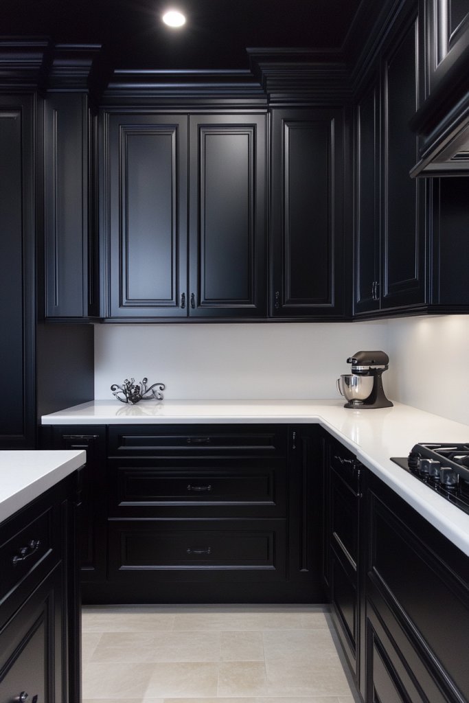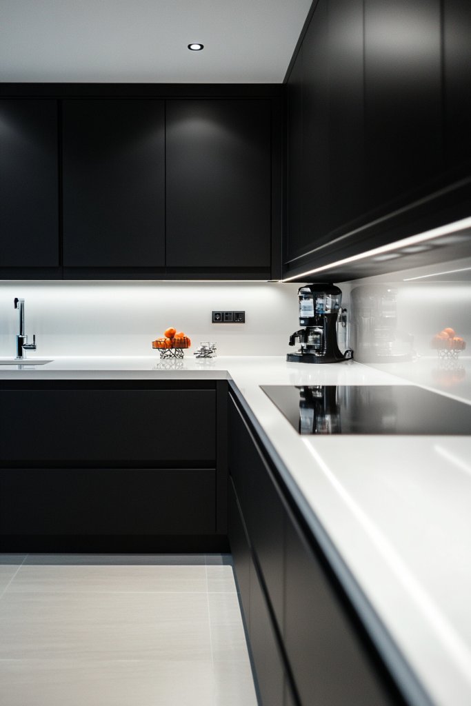 7. Matte Black Cabinets with Contrasting White Countertops for Sharp Contrast
