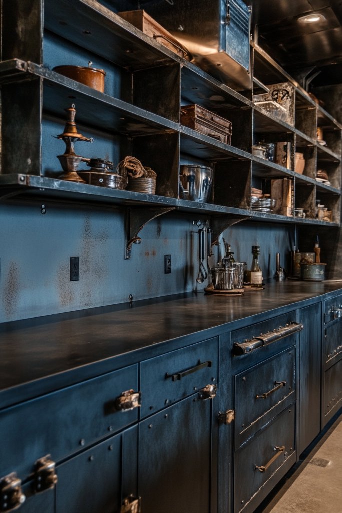 8. Industrial-Inspired Dark Cabinets with Metal Accents and Open Storage