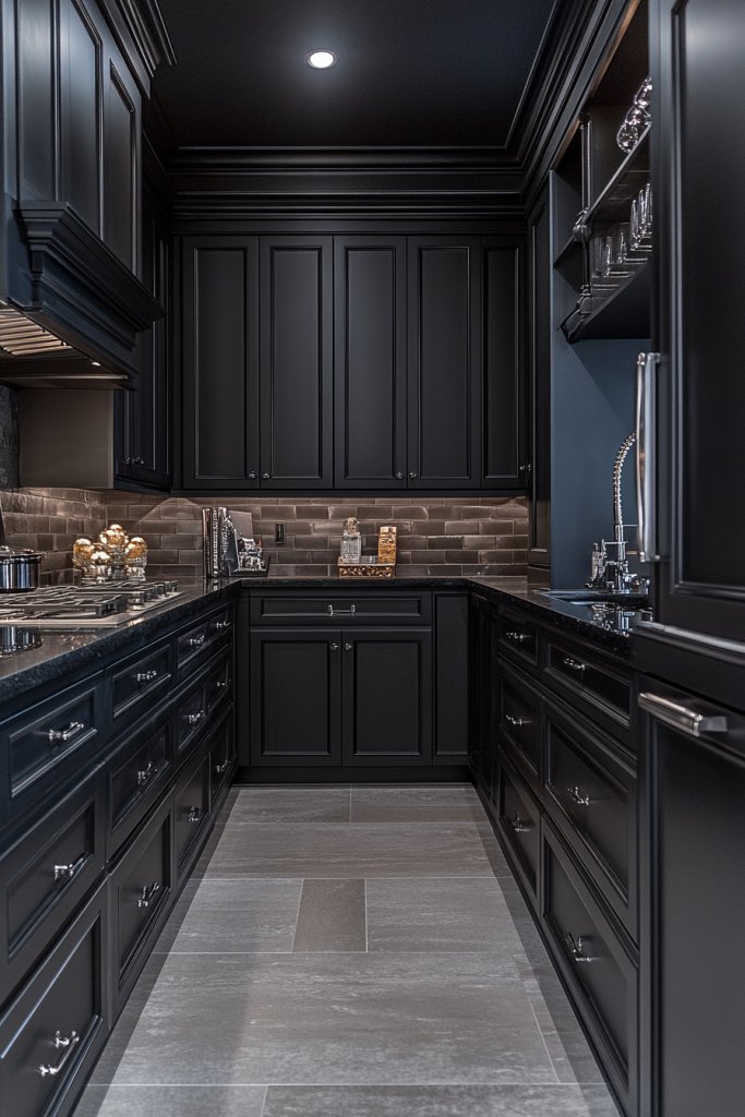 You can soften the look with textured or patterned backsplashes, or keep it stark with simple subway tiles. Pair with stainless steel or brushed nickel fixtures for a subtle shine. Incorporate warm wood accents or textiles to add coziness and balance. This design works well in open-concept kitchens or small spaces looking for a bold upgrade.