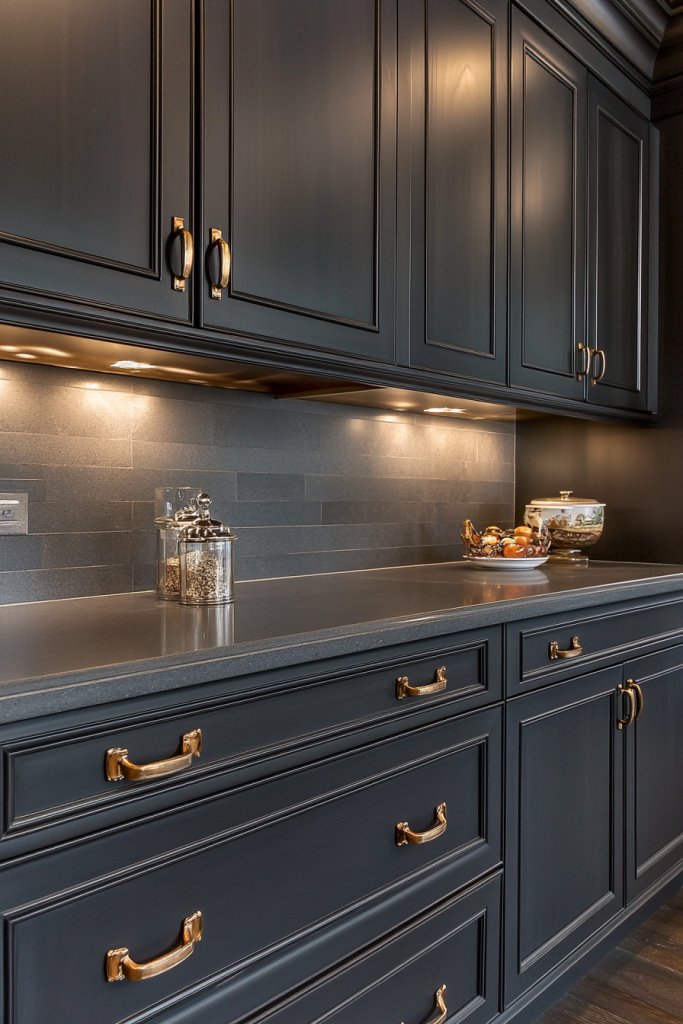 10. Dark Gray Cabinets with Warm Toned Hardware for Balance and Comfort