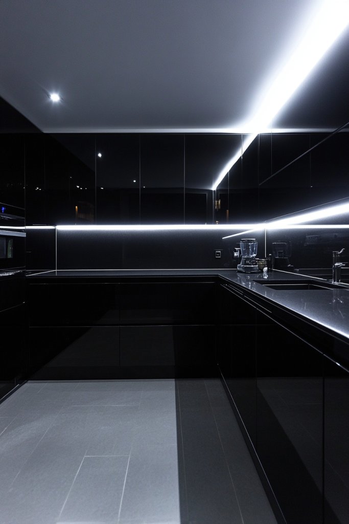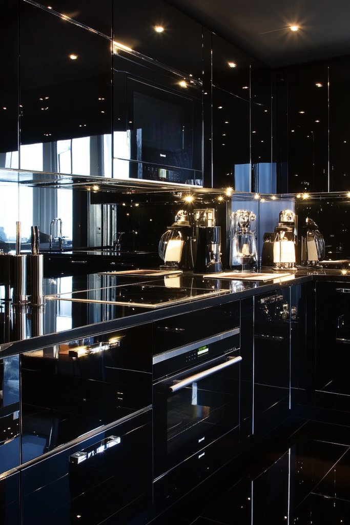 12. Glossy Black Cabinets with Reflective Surfaces for a High-Impact Look