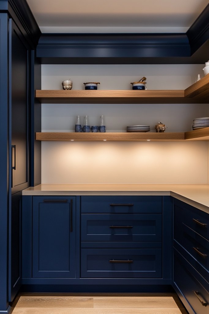 Picture deep navy cabinets with matte or satin finishes that absorb light, giving a velvety appearance. The open shelves are made of sleek wood or metal, creating a floating effect that enhances the airy feel. Bright, colorful dishware or minimalist ceramics are displayed confidently, adding personality. The contrast between the dark cabinetry and open shelves creates a balanced, inviting atmosphere that’s perfect for entertaining.