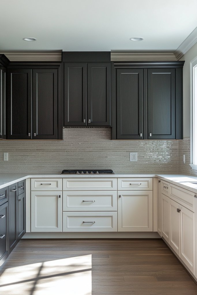 Picture a kitchen with dark charcoal lower cabinets paired with crisp white or soft beige upper cabinets. The contrast draws your eye across the space, creating a sense of depth and dimension. The dark base grounds the room, while the lighter upper cabinets keep it feeling open and airy. Textured or matte finishes on the darker cabinets add richness, while glossy or smooth finishes on the lighter upper cabinets keep things fresh.