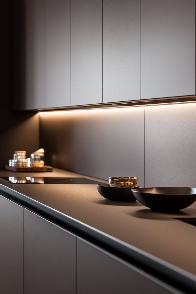 Select cabinetry with a matte finish that resists scratches and fingerprints. Use textured laminates or paints designed for durability. Install with precise measurements to ensure seamless alignment and handleless operation if desired. Pair with light-colored countertops and backsplashes to brighten the space. Clean with gentle, non-abrasive cleaners to maintain the matte texture. Regular upkeep keeps the depth and richness intact.