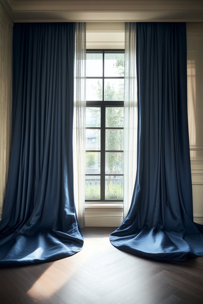 Visualize flowing, deep navy or indigo curtains made from a luxurious fabric like velvet or heavy linen, hanging from sleek black or gold curtain rods. The curtains gently pool on the floor, adding softness and a regal feel.