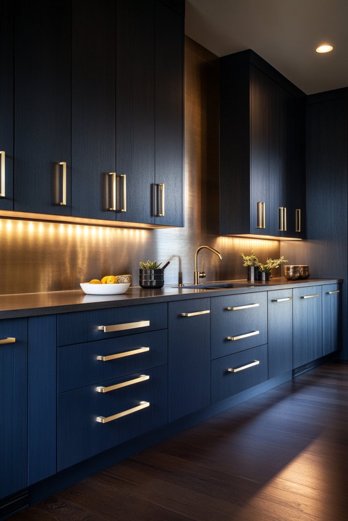 Imagine navy-blue cabinetry with sleek, matte or semi-gloss finish, accented by shiny brass or gold knobs, pulls, and handles. The contrast between the cool, deep blue and warm metallics adds visual interest and a touch of glamour.