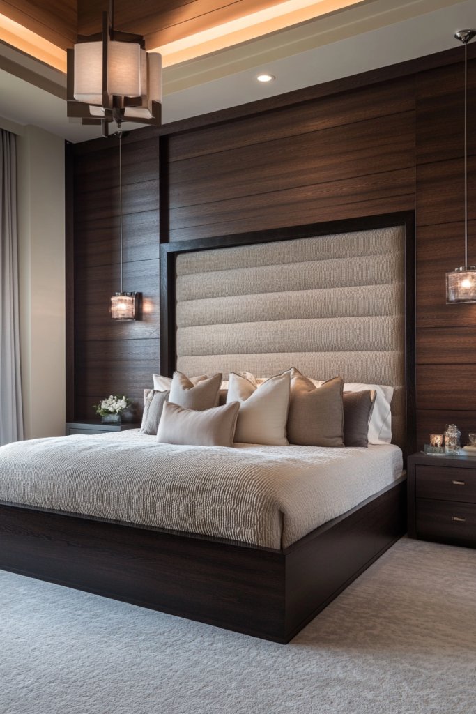 Dark wood paneling or an accent wall in a rich, deep finish creates a striking focal point in your bedroom, adding depth and architectural interest. This design feature emphasizes the natural beauty of dark wood while providing a sophisticated backdrop that enhances your furniture and decor.