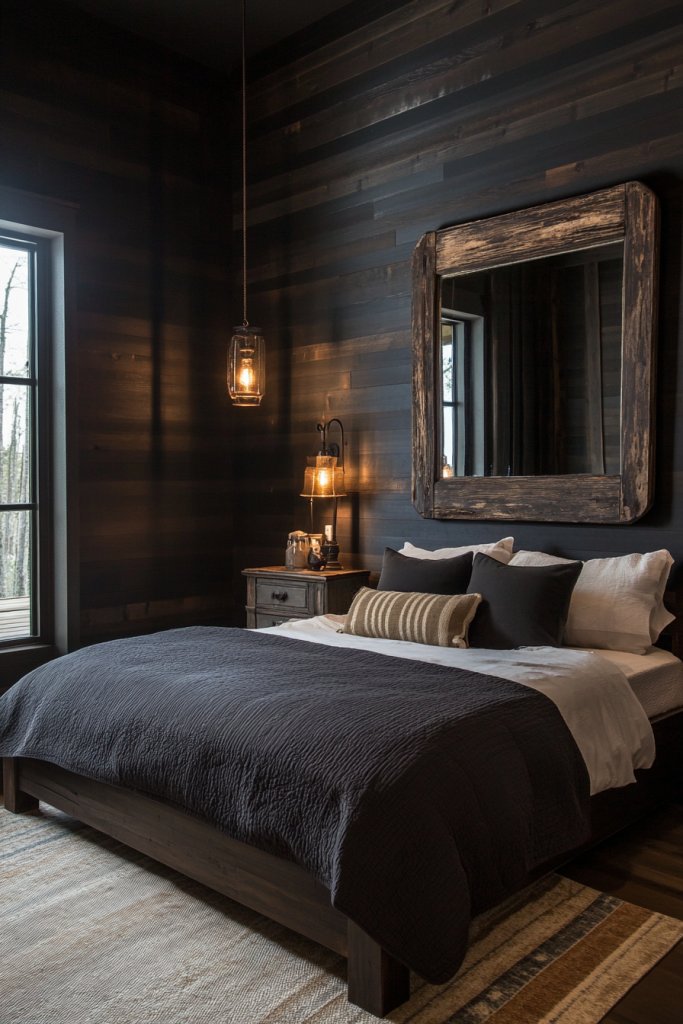 It transforms a simple space into a refined sanctuary with a timeless appeal. Visualize a wall behind the bed covered in wide, dark walnut or mahogany panels, or painted with a textured, matte dark stain that emphasizes the wood grain.