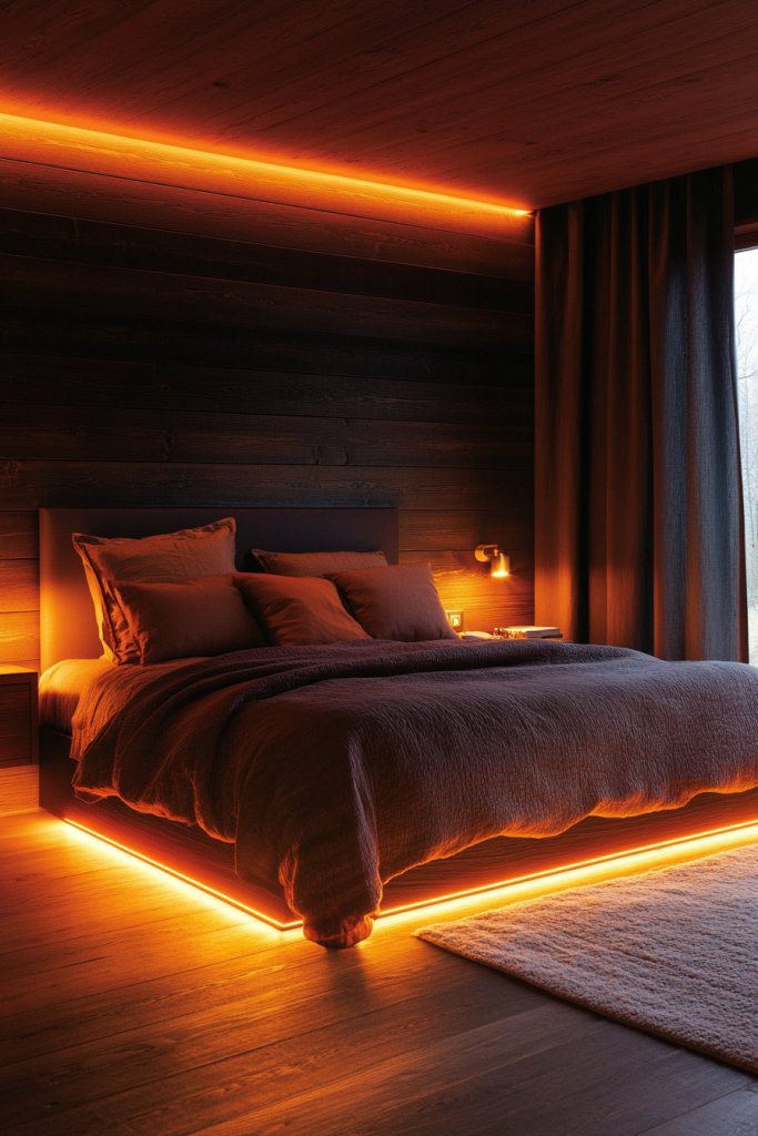 A layered lighting scheme transforms a dark wood bedroom into a warm, inviting sanctuary. Combining warm LED lamps, bedside sconces, and a statement chandelier creates depth and ambiance, allowing you to tailor the mood for relaxation or activity.