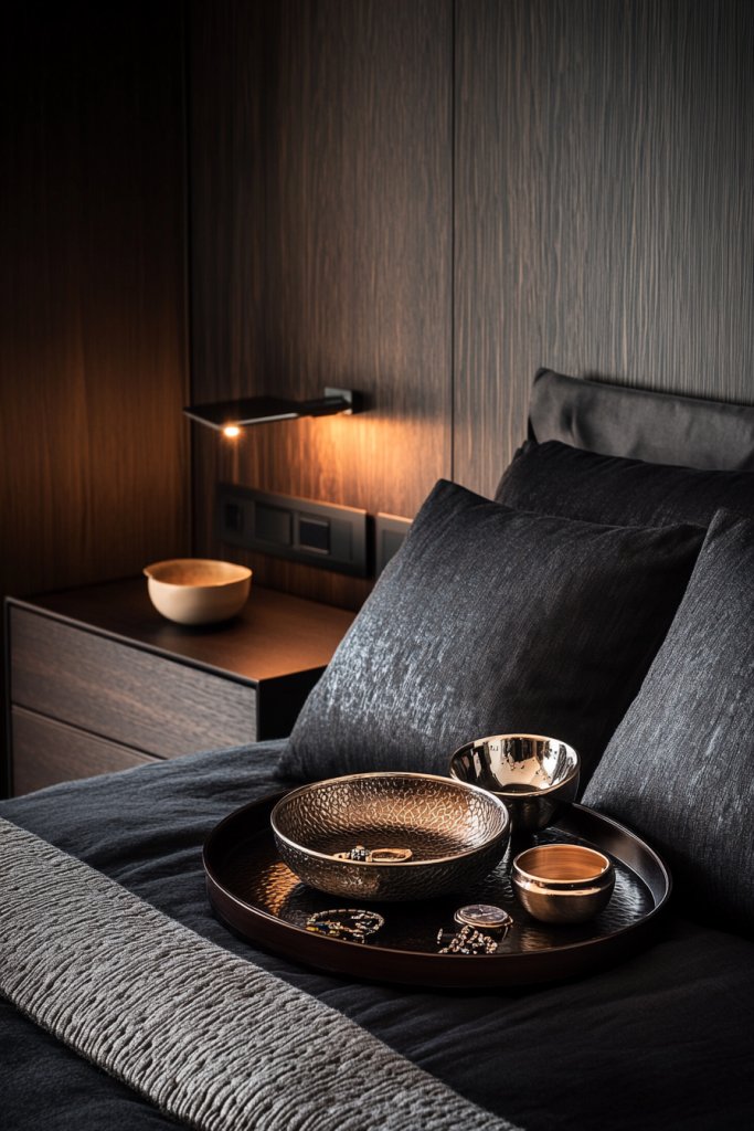 Elegant trays or decorative bowls are both practical and stylish accessories that help organize personal items while adding a touch of sophistication to your dark wood bedroom. This idea is valuable because it combines functionality with aesthetic appeal, keeping surfaces clutter-free and visually cohesive.