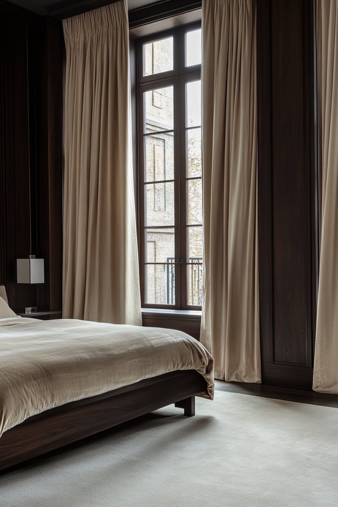 Choosing window treatments in luxe fabrics such as velvet or linen instantly adds sophistication and texture to a dark wood bedroom. These materials in neutral shades like soft beige, warm taupe, or elegant cream create a seamless, calming backdrop that complements the richness of dark wood furniture.