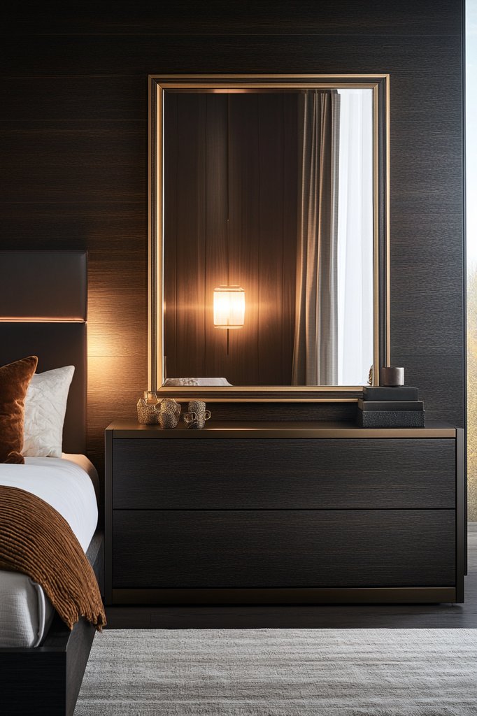 Adding mirror frames in gold or black instantly elevates your bedroom’s depth and sophistication, creating a layered and luxurious feel. These frames serve as eye-catching focal points that reflect light and add dimension to dark wood furniture, making the space feel larger and more inviting.