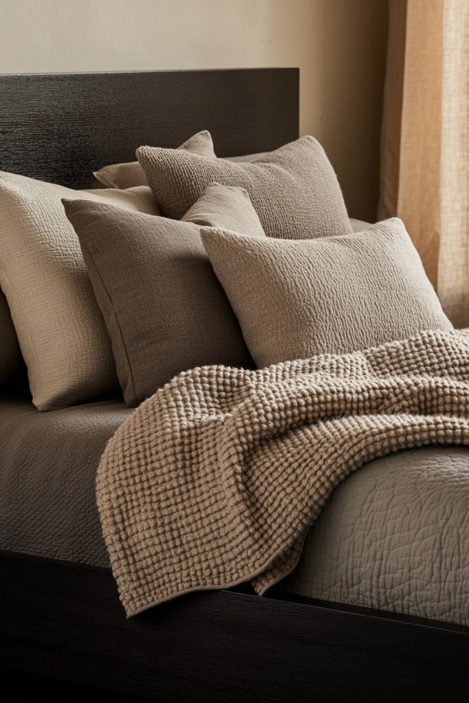 Think of a collection of pillows in shades like dusty rose, muted taupe, or cool greys, accented with textures like velvet, faux fur, or chunky knit to invite touch and coziness. Visualize a bed dressed in a crisp white duvet, topped with a selection of plush pillows in varying sizes—some with silky covers, others with textured weaves—and a cozy throw blanket in soft charcoal or pale beige draped casually at the foot.