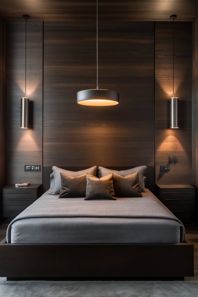 Statement pendant lights or wall sconces in sleek, modern designs serve as functional art pieces that brighten and define your dark wood bedroom with style. These fixtures introduce a contemporary edge, creating focal points that draw the eye upward and add visual height to the space.