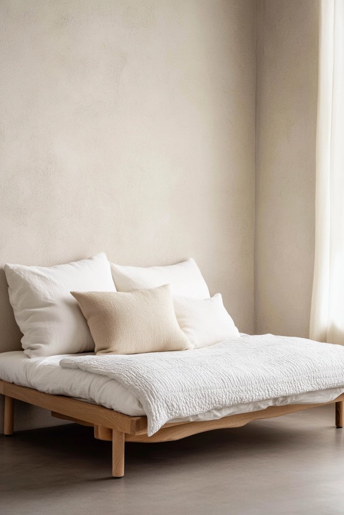 Imagine a sleek, light wood frame with smooth, rounded edges sitting against a soft neutral wall. Crisp white linens and a textured throw blanket add subtle contrast, while a few carefully chosen pillows enhance comfort. The airy space feels open and calming, with natural light softly filtering through a simple window treatment. This setup exudes tranquility and effortless style.