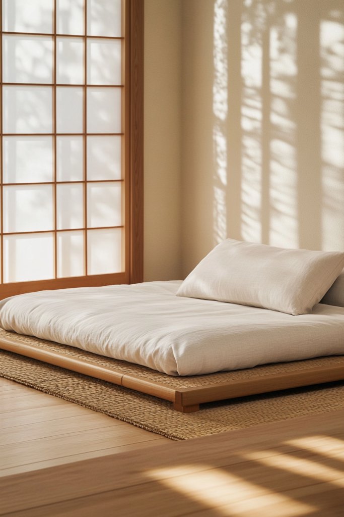 Imagine a simple, low wooden frame with a natural or light finish, topped with a traditional tatami mat. The bedding is lightweight yet cozy, with crisp cotton sheets and a soft, textured blanket. The space feels open and uncluttered, with minimal decor—perhaps a small, simple floor lamp or a few scrolls on the wall. The atmosphere is tranquil, inviting meditation and rest.