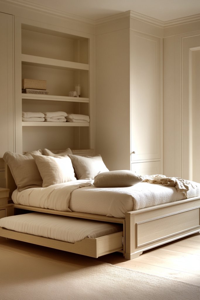 Imagine a sleek, low-profile bed with a pull-out or fold-away trundle beneath. The main bed is dressed in neutral linens with decorative cushions, while the trundle is dressed similarly for consistency. When guests arrive, you simply pull out the lower bed, and your space transforms into a cozy guest suite. When not in use, it tucks away neatly, keeping your room looking tidy and stylish.