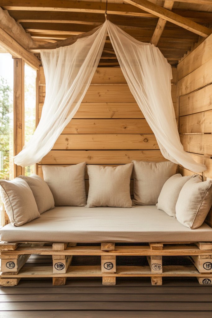 18. DIY Pallet Day Bed with Custom Cushions and Canopy