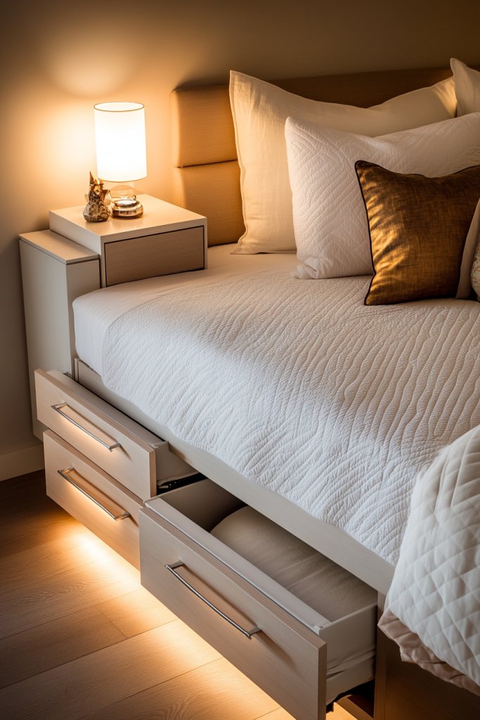 Picture a sturdy, stylish bed frame with sleek, integrated drawers underneath. The drawers blend seamlessly into the design, with smooth handles or push-to-open mechanisms. Soft bedding in calming colors invites relaxation, while the open space beneath the bed keeps essentials close at hand yet out of sight. The overall look is tidy, functional, and modern.